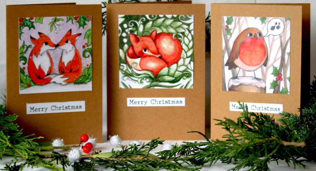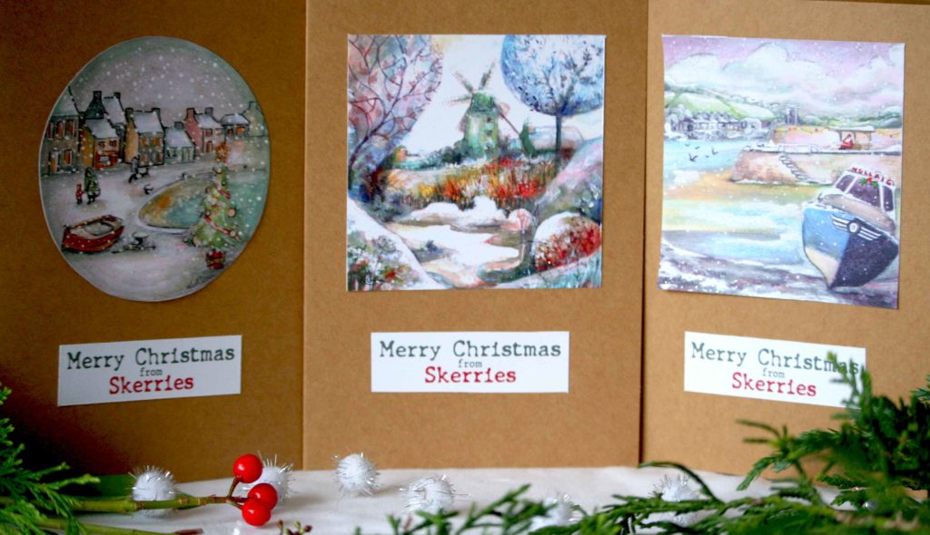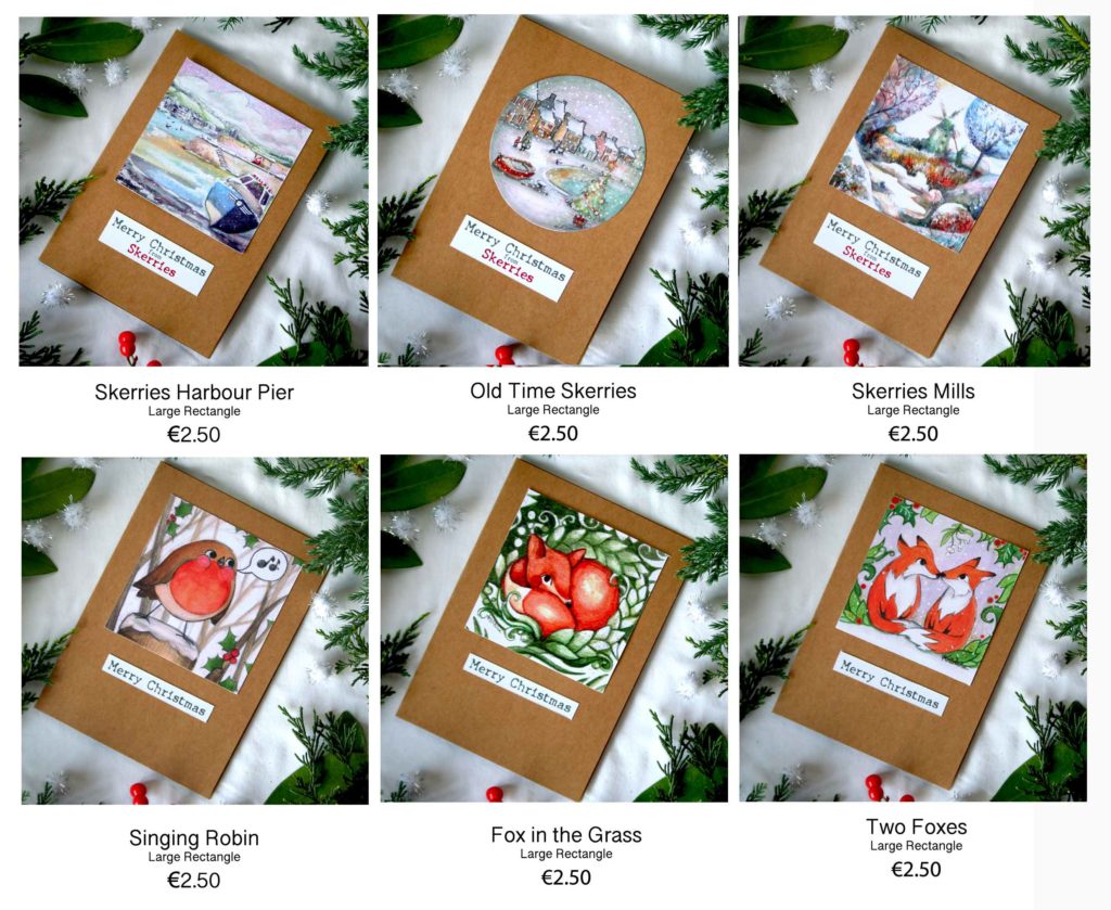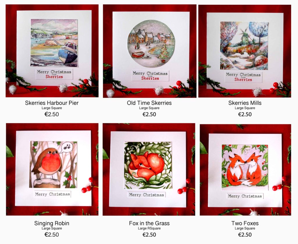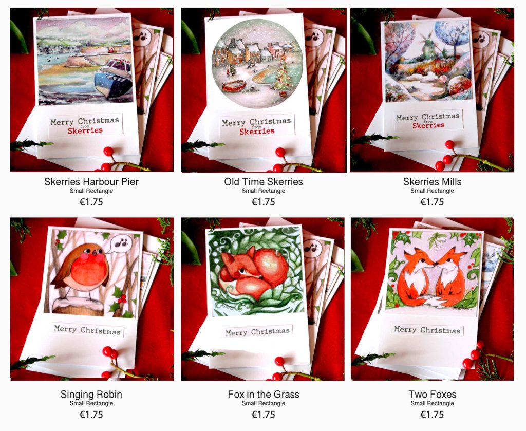 New designs and a variety of sizes and price options are available as of today with my homemade Christmas Cards! The old favourite “Fox in the Grass” now has two companion cards: Two foxes under the mistletoe, and a robin singing on a snow-covered fence post. Similarly, the classic Skerries Mills painting I offered last time has a new twist with brighter colours and two new companions: Skerries Harbour Pier and Old Time Skerries.